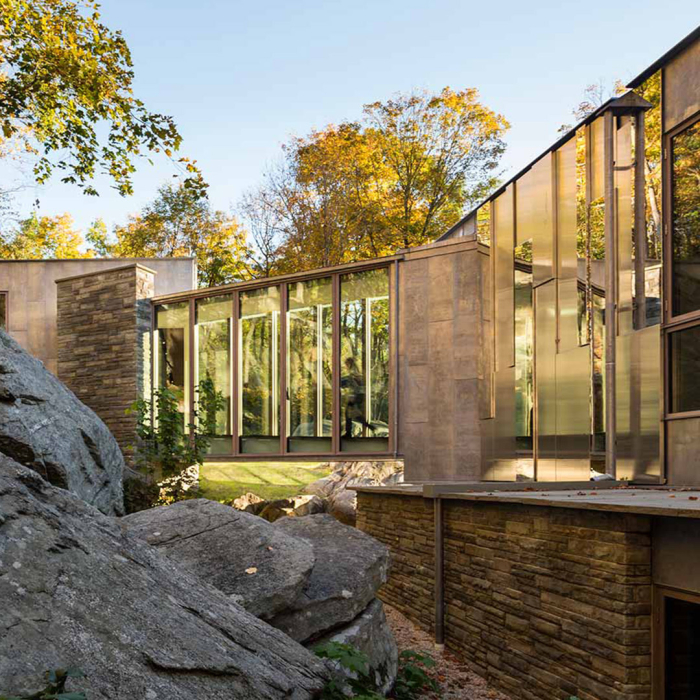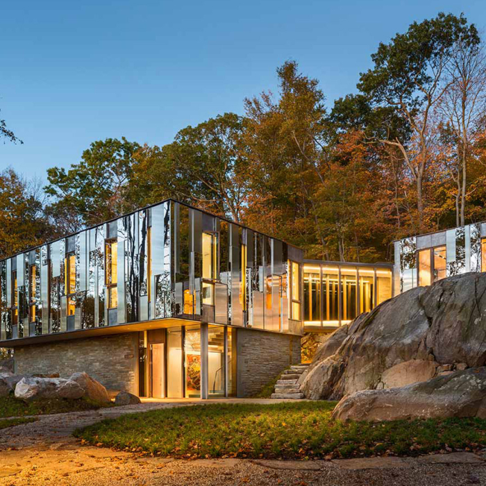 Jak postavit dům tak, aby podtrhoval spojení s okolním lesem? Architekt Kieran Timberlake vyřešil požadavek klienta zrcadlovým domem, který je zabudován do starověkého ledovcového skaliska.